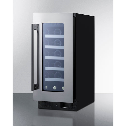 Summit offers the industry's largest selection of 32" high ADA compliant appliances, with quality choices for built-in or freestanding use in 15" wide spaces. The ALWC15 is a wine cellar sized just under 15" wide and 32" high to fit under lower ADA compliant counters. The front-breathing system allows built-in installation, while the fully finished black cabinet also makes it safe for freestanding use. This unit features a user-reversible double pane tempered glass door complete with seamless stainless steel trim, fully articulating European style hinge, and a pro style handle. The front lock offers added security. For added space savings, the ALWC15 is designed with a sealed back and right angle cord. Five wooden shelves let you store up to 23 bottles of your favorite wine. The shelves are specially designed to store either standard Bordeaux style or wider Burgundy style bottles. Recessed LED lighting offers an attractive and energy efficient presentation for your collection. This model utilizes automatic defrost for easy maintenance and includes an internal fan to ensure more even temperature distribution. An audible alarm sounds if the door has been left open for over one minute, or if the temperature has risen out of the recommended storage range. This unit is also equipped with Sabbath mode to allow users the option of disabling certain electrical functions during periods of religious observance. With its unique size and user-friendly features, the ALWC15 is the perfect choice for bringing quality wine storage to ADA compliant settings. Additional ADA compliant choices are available in 6", 18", 24", and 36" wide sizes.