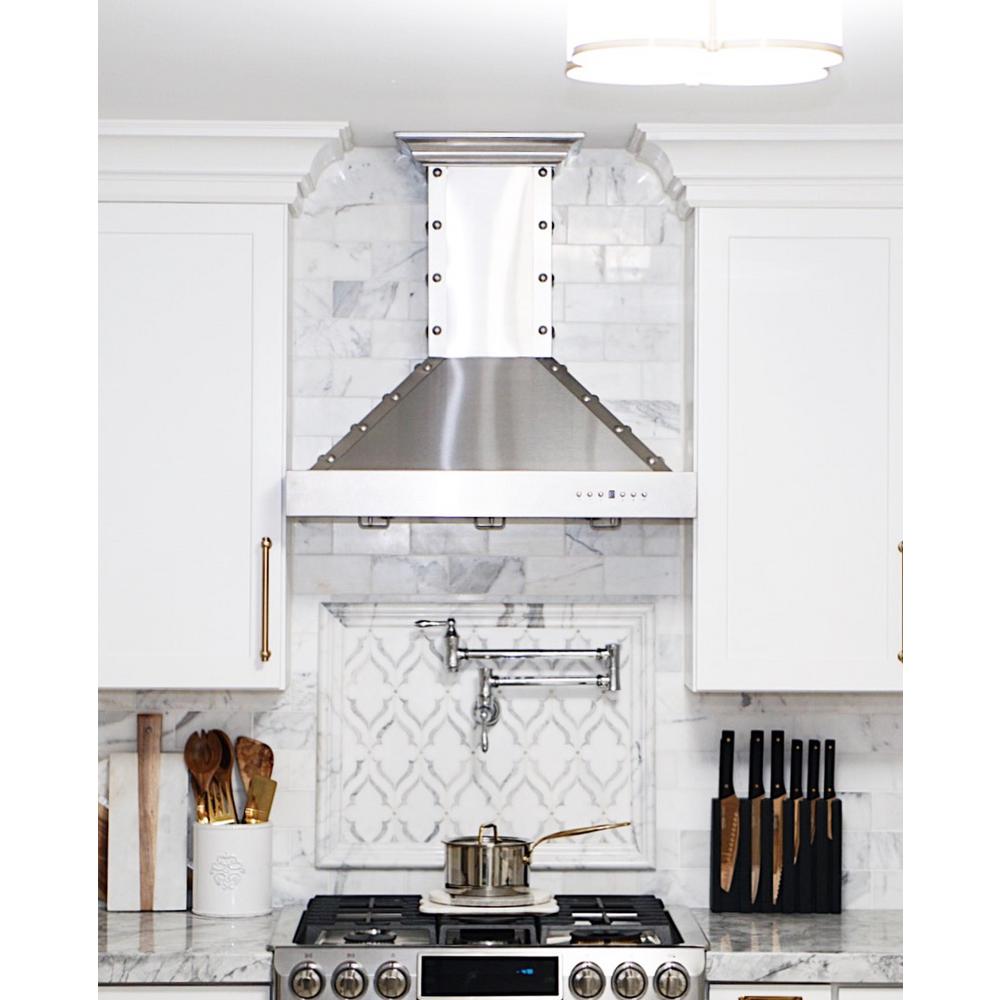 ZLINE 36 in. 400 CFM Designer Series Wall Mount Range Hood (KB2-4SSXS-36) has a modern design and built-to-last quality, making it a great addition to any indoor or outdoor kitchen. Equipped with the highest quality, 304 grade stainless steel and snow finished embellishments, this hood is rust and weather resistant giving it the most desirable finish for indoor and outdoor kitchens alike. This hood's high-performance, 400CFM 4-speed motor will provide all the power you need to quietly and efficiently ventilate your kitchen while cooking. Enjoy modern features, including built-in LED lighting for illuminated cooking and dishwasher-safe stainless steel baffle filters for easy clean-up. ZLINE Hoods are ETL and UL Listed and have one of the easiest installations in the industry. Includes a 36 in. chimney with elegant crown molding for ceilings up to 9.5 ft. (must be custom cut to appropriate height) and a 61 in. Chimney Extension (not included) is available for ceilings up to 12.5 ft. ZLINE continues to revolutionize the industry by providing our customers with Attainable Luxury®. ZLINE stands by all products with its manufacturer parts warranty. The KB2-4SSXS-36 ships next business day when in stock.