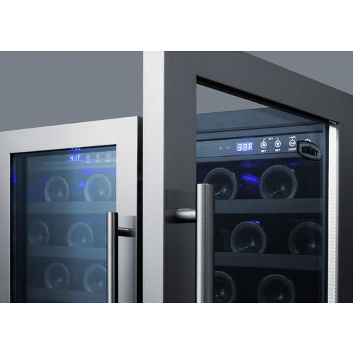 SUMMIT's collection of built-in undercounter wine cellars offers quality storage with user-friendly convenience and elegant style. The SWC3066B is a 30" wide wine cellar designed for built-in installation under counters. The fully finished black cabinet also allows freestanding use. This unit includes two seamless stainless steel trimmed glass doors with a unique French door swing. Both include factory installed locks and professional handles. Two separate zones feature independent digital thermostats, letting you chill white and sparkling wine in one section while preserving reds under warmer temperatures in the other. Both zones include six wooden shelves in a jet black finish and slotted floors, letting you store up to 66 standard 750ml Bordeaux bottles inside the unit. Alternatively, you can fit up to 46 wider "Burgundy" style bottles (often used for chardonnay and pinot noir) in addition to 10 Bordeaux bottles. The slotted floor can store six champagne bottles. Recessed LED lighting offers an attractive view to let you display your wine collection in style. With a professional look and innovative design, SUMMIT SWC3066B is a unique addition to any home. For a similar unit designed for wine and beverage storage, see the SWBV3067B.