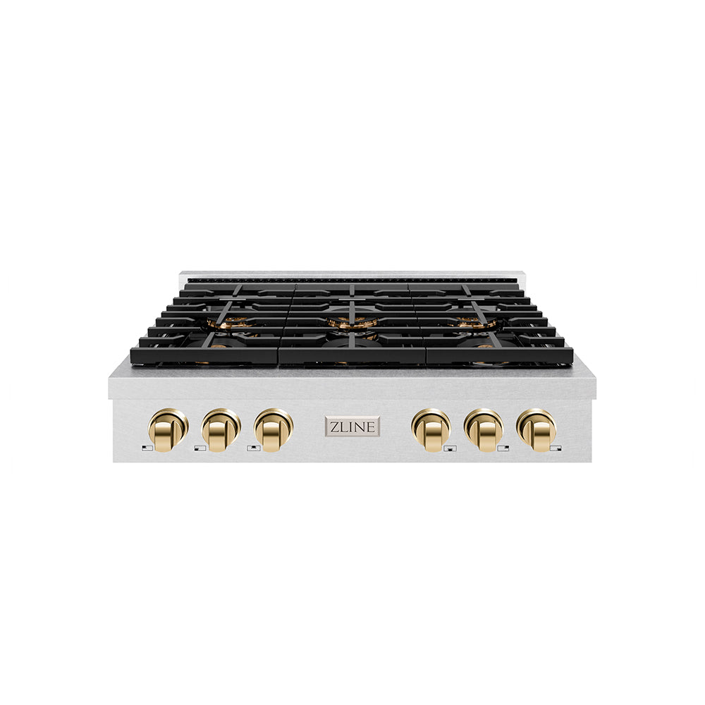ZLINE Autograph Edition 36 in. Paramount Gas Rangetop with 6 Burner DuoPro™ Cooktop in Satin Stainless Steel and Polished Gold Accents (PSRTSZ-36-G)