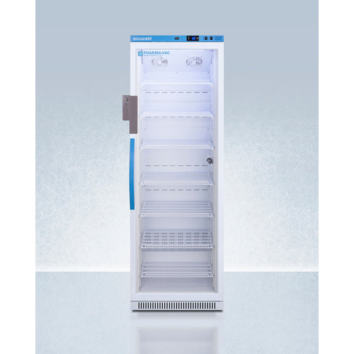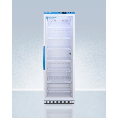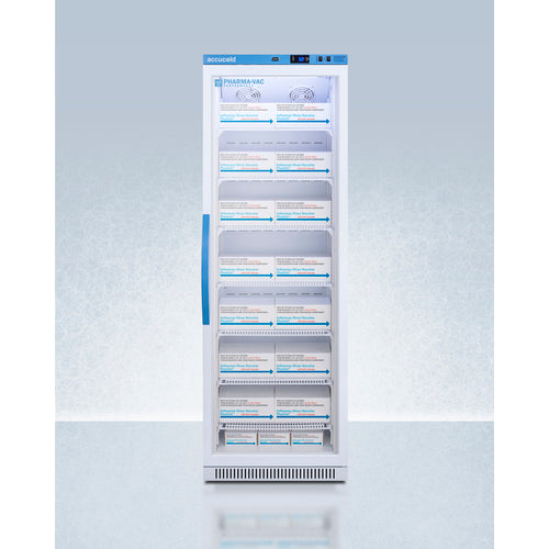 Accucold is proud to lead the industry with the largest line of cold storage product sizes certified to NSF/ANSI 456 Vaccine Storage Standard. The Pharma-Vac Performance Series supports meeting regulations and guidelines from the CDC, State Agencies, World Health Organization, and other Health Ministries on vaccine storage and handling. Model ARG15PV456 is a 15 cu.ft. all-refrigerator with an adjustable control range from +2 to +8ÂșC. The microprocessor temperature controller is externally located to minimize door openings, helping to protect stored contents from ambient temperature. The buffered temperature probe is encased in a glycol-filled bottle to better simulate temperature of the stored product, with an additional sensor that reads air temperature to ensure superior temperature control. The current and min/max temperature display is viewable in Celsius or Fahrenheit to the nearest tenth of a degree. We include a certificate of calibration for your records. The audible and visual temperature alarm sounds if the unit's interior goes out of range. Additional alarms include a power failure alert, door open alarm, and sensor failure alarm. This unit is equipped with remote alarm contacts in the rear and a 1/2" probe port on the right side to accept additional monitoring devices. A hospital grade cord with 'green dot' plug is also included for added safety in high traffic areas. Inside, the ARG15PV456 utilizes adjustable cycle defrost operation to avoid temperature spikes. Optimized forced air cooling with two internal fans ensures excellent temperature stability and uniformity with rapid recovery after door openings. The adjustable plastic-coated wire shelves can be positioned at 1/2" increments to accommodate virtually any sized item. We include seven shelves, more than competitor products providing to maximize interior shelving storage area. This unit includes LED internal lighting with an on/off rocker switch. The interior is constructed from white powder coated metal to ensure added durability and better temperature retention. The ARG15PV456 comes in a white cabinet finish with a blue accented control panel. The factory-installed antimicrobial handle is powder-coated with naturally occurring silver ions, which help to reduce the spread of germs, allowing for a safer, cleaner user experience. The double pane tempered glass door provides a full view of the interior. The door is self-closing for added protection of stored items. This model includes a factory-installed lock and ships with two keys for staff use. Powerful magnetic gaskets ensure a positive seal. Designed with hydrocarbon refrigerant, the ARG15PV456 provides an energy efficient solution to vaccine storage. This unit is Pyxis, Omnicell, and AcuDose RX compatible. Additional sizes, as well as solid door options, are also available. Explore the full Pharma-Vac NSF 456 series at accucold.com/pharmavac. ABOUT NSF 456: NSF/ANSI 456 is a voluntary standard introduced in 2021 that was designed to establish the performance and construction requirements for vaccine refrigeration. Models certified to this standard undergo strict testing to confirm temperatury consistency. All Accucold units approved to NSF 456 for vaccine storage are certified by an independent testing agency.