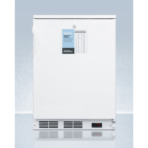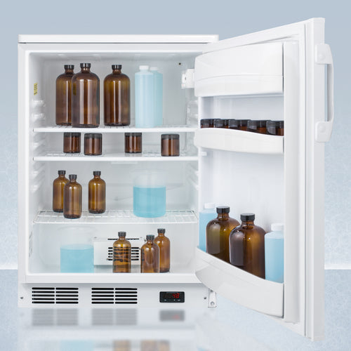 Accucold's PRO Series features all-refrigerators and all-freezers designed for reliable temperature stability in institutional settings. Sized just under 24" wide, the FF6LWPRO is an all-refrigerator designed for freestanding use in hospitals, doctors' offices, and other facilities with specific temperature needs. Made in Europe, it comes in a white finish with a fully finished cabinet and user-reversible door swing. A hospital grade cord with a 'green dot' plug offers added safety in high traffic areas and factory-installed lock is located towards the top of the unit for convenient security. This unit includes a digital thermostat for optimum temperature precision located in the kickplate. Inside, the FF6LWPRO utilizes automatic defrost operation for reduced maintenance. An internal fan helps to stabilize the 5.5 cu.ft. interior temperature from top to bottom. Adjustable wire shelves and door racks offer convenient storage solutions. This unit includes an automatic interior light and a factory-installed probe hole for users to install their own temperature monitoring equipment. The FF6LWPRO can be paired with a matching low temperature all-freezer (model VT65MLPRO). Additional options, including NIST calibrated temperature alarms and data loggers, can also be added. Contact our product specialists for more information. *NOTE: This unit's thermostat is pre-set for Celsius. If you prefer Fahrenheit, add complimentary option DTMEDF or let your sales representative know upon order.