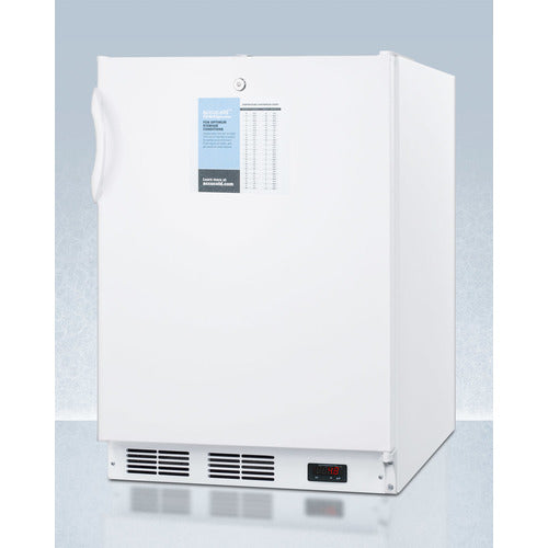 Accucold's PRO Series features all-refrigerators and all-freezers designed for reliable temperature stability in institutional settings. Sized at 32" high and just under 24" wide, the FF7LWPROADA is an all-refrigerator designed for freestanding use in settings following ADA compliant guidelines. Made in Europe, it comes in a white finish with a fully finished cabinet with a user-reversible door. A hospital grade cord with a 'green dot' plug offers added safety in high traffic areas and factory-installed lock is located towards the top of the unit for convenient security. This unit includes a digital thermostat for optimum temperature precision located in the kickplate. Inside, the FF7LWPROADA utilizes automatic defrost operation for reduced maintenance. An internal fan helps to stabilize the 5.5 cu.ft. interior temperature from top to bottom. Adjustable wire shelves offer flexible storage, with a flat door liner that offers deeper storage space. This unit includes an interior light on an on/off rocker switch and a factory-installed probe hole for users to install their own temperature monitoring equipment. The FF7LWPROADA is ETL-S listed to NSF-7 standards for use in commercial settings. Additional options, including NIST calibrated temperature alarms and data loggers, can also be added. Contact our product specialists for more information. *NOTE: This unit's thermostat is pre-set for Celsius. If you prefer Fahrenheit, add complimentary option DTMEDF or let your sales representative know upon order.