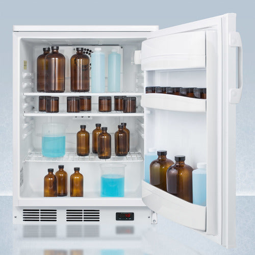 The FF6LWBIPLUS2 is an all-refrigerator sized at just under 24" wide. Made in Europe, it comes in a white exterior finish with a keyed lock located towards the top of the door for convenient security. The front-breathing system allows built-in installation under counters, while the fully finished cabinet also enables freestanding use. A digital thermostat is located in the kickplate for easy and precise temperature management. The unit uses automatic defrost operation and includes an internal fan for stabilized cooling. Adjustable wire shelves offer flexible storage inside the 5.5 cu.ft. interior, with door racks and an automatic light included. The FF6LWBIPLUS2 includes a thermometer calibrated to NIST standards in our ISO/IEC 17025:2017 laboratory. It displays the current, minimum, and maximum temperature to the nearest tenth degree viewable in Celsius or Fahrenheit. The buffered temperature probe is stored in a glycol-filled bottle to ensure the temperature reading best reflects the temperature of other stored refrigerator contents. The FF6LWBIPLUS2 can be further customized with a variety of options, including data loggers, alarms, and more. Contact our sales team for more information. Accucold's PLUS2 series refrigerators are intended for a wide variety of basic storage only. Storage of high-value vaccines, life science materials, medical, or clinical biologicals require a product with design features including, but not limited to tighter temperature controls, monitoring, and/or back-up. *NOTE: This unit's thermostat is pre-set for Celsius. If you prefer Fahrenheit, add complimentary option DTMEDF or let your sales representative know upon order.