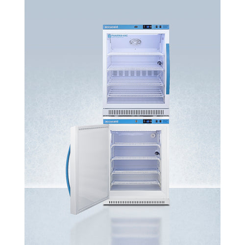 Accucold offers innovative solutions to vaccine storage with our Performance Series stackable purpose-built refrigerator-freezer combinations designed to support meeting CDC/VFC/VFA guidelines. Sized just under 24" wide, the ARG6PV-AFZ5PVBIADASTACKLHD combines the 6 cu.ft. ARG6PV auto defrost all-refrigerator with AFZ5PVBIADA all-freezer into one slim footprint using Accucold's StackRack. This ships in three boxes and requires some minor assembly upon delivery. Both units feature left hand door swings. The Pharma-Vac Performance Series is designed to meet the demanding needs of vaccine storage. Both units utilize a microprocessor temperature controller (refrigerator range: +2 to +8ÂșC; freezer range: -30 to -10ÂșC). The buffered temperature probe is encased in a glycol-filled bottle to better simulate temperature of the stored product, with an additional sensor that reads air temperature to ensure superior temperature control. The current and min/max temperature display is viewable in Celsius or Fahrenheit to the nearest tenth of a degree. The audible and visual temperature alarms sound if the units' interiors go out of range. Additional alarms include a power failure alert, door open alarm, and sensor failure alarm. Both units are equipped with remote alarm contacts in the rear and a 1/2" probe port on the right side to accept additional monitoring devices. The factory-installed antimicrobial handles are powder-coated with naturally occurring silver ions, which help to reduce the spread of germs, allowing for a safer, cleaner user experience. A hospital grade cord with 'green dot' plug is also included for added safety in high traffic areas. Inside, the ARG6PV refrigerator utilizes adjustable cycle defrost operation to avoid temperature spikes. Optimized forced air cooling with an internal fan ensures excellent temperature stability and uniformity with rapid recovery after door openings. The adjustable plastic-coated wire shelves can be positioned at 1/2" increments to accommodate virtually any sized item. This unit includes LED internal lighting with an on/off rocker switch. The interior is constructed from white powder coated metal to ensure added durability and better temperature retention. The refrigerator is designed to be stacked on top of the AFZ5PVBIADA, our Performance Series 3.88 cu.ft. all-freezer that utilizes static manual defrost operation. The freezer includes four adjustable plastic-coated wire shelves for flexible storage. Both units include front-mounted keyed locks and powerful magnetic gaskets to ensure a positive seal. Additional stacked combinations are available. Browse Accucold's website for more information, or contact our sales team at 718-893-3900 to discuss your equipment needs. NOTE: Accucold refrigerators are purpose-built to the support meeting the current CDC (Centers for Disease Control) guidelines for the storage of vaccines. As referenced in the current Vaccine Storage and Handling Toolkit, these units incorporate microprocessor controls and forced air circulation for stable operation between 2 and 8ÂșC. For additional temperature assurance, the CDC recommends a calibrated digital data logger (DDL), which can be added with the factory-installed option DL2B or addition of the DL2BKit accessory.