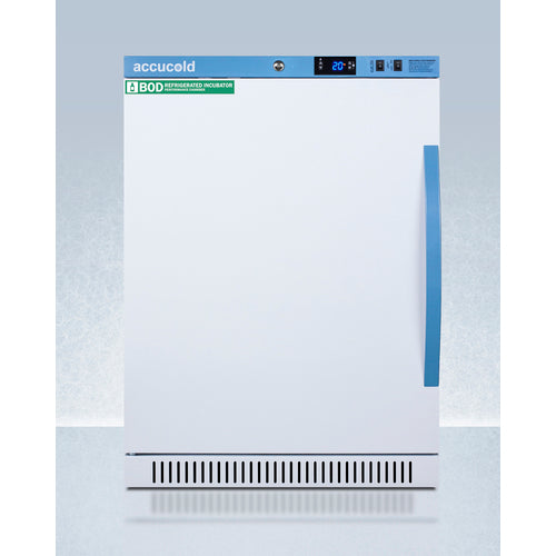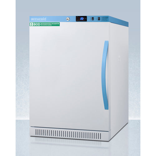 Accucold's Performance Series includes BOD refrigerated incubators designed to provide reliable cold storage in water treatment centers, environmental laboratories, and other research facilities. Model ABOD6LHD is a 6 cu.ft. refrigerated incubator. The adjustable control range allows you to manage the temperature between 4Âș and 60ÂșC (39.2 to 140ÂșF) and comes preset at 20ÂșC. The microprocessor temperature controller is externally located to minimize door openings, helping to protect stored contents from ambient temperature. The buffered temperature probe is encased in a glycol-filled bottle to better simulate temperature of the stored product, with an additional sensor that reads air temperature to ensure superior temperature control. The current and min/max temperature display is viewable in Celsius or Fahrenheit to the nearest tenth of a degree. The audible and visual temperature alarm sounds if the unit's interior goes out of range. Additional alarms include a power failure alert, door open alarm, and sensor failure alarm. This unit is equipped with remote alarm contacts in the rear and a 1/2" probe port on the right side to accept additional monitoring devices. It comes with a hospital grade cord with a green dot plug for added safety in high traffic laboratory and research areas. Inside, the ABOD6LHD utilizes adjustable cycle defrost operation to avoid temperature spikes. Optimized forced air cooling with one internal fan ensures excellent temperature stability and uniformity with rapid recovery after door openings. The adjustable plastic-coated wire shelves can be positioned at 1/2" increments to accommodate virtually any sized bottle. This unit includes LED internal lighting with an on/off rocker switch so you can ensure the interior contents are not unnecessarily exposed to light. The interior is constructed from white powder coated metal to ensure added durability and better temperature retention. This refrigerated incubator comes in a white cabinet finish with a blue accented control panel. The factory-installed antimicrobial handle is powder-coated with naturally occurring silver ions, which help to reduce the spread of germs, allowing for a safer, cleaner user experience. The door ships with a left hand swing and self-closing function. This model includes a factory-installed lock and ships with two keys for staff use. Powerful magnetic gaskets ensure a positive seal. Designed with hydrocarbon refrigerant, the ABOD6LHD provides an energy efficient solution to water storage. Additional size are available, as well as upgrades including digital data loggers, keyless entry locks, and more. Browse the complete Accucold lineup at accucold.com.