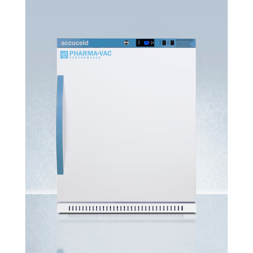 Accucold's Pharma-Vac Performance Series are upright all-refrigerators designed and purpose-built for pharmacy, medication, and vaccine applications to support meeting CDC/VFC/VFA guidelines. The ARS62PVBIADA is a 6 cu.ft. all-refrigerator with a temperature range of +2°C to +8°C. Sized at just under 32" high to fit under lower counters complying with ADA guidelines for accessibility. It is designed for freestanding or recessed installation. The microprocessor temperature controller is externally located to minimize door openings, helping to protect stored contents from ambient temperature. The buffered temperature probe is encased in a glycol-filled bottle to better simulate temperature of the stored product, with an additional sensor that reads air temperature to ensure superior temperature control. The current and min/max temperature display is viewable in Celsius or Fahrenheit to the nearest tenth of a degree. The audible and visual temperature alarm sounds if the unit's interior goes out of range. Additional alarms include a power failure alert, door open alarm, and sensor failure alarm. This model is equipped with remote alarm contacts in the rear and a 1/2" probe port on the right side to accept additional monitoring devices. A hospital grade cord with 'green dot' plug is also included for added safety in high traffic areas. Inside, the ARS62PVBIADA utilizes adjustable cycle defrost operation to avoid temperature spikes. Optimized forced air cooling with an internal fan to ensure excellent temperature stability and uniformity with rapid recovery after door openings. The adjustable plastic-coated wire shelves can be positioned at 1/2" increments to accommodate virtually any sized item. This unit includes LED internal lighting with an on/off rocker switch. The interior is constructed from white powder coated metal to ensure added durability and better temperature retention. The ARS62PVBIADA comes in a white cabinet finish with a blue accented control panel. The factory-installed antimicrobial handle is powder-coated with naturally occurring silver ions, which help to reduce the spread of germs, allowing for a safer, cleaner user experience. The user-reversible door ships with a right hand swing and self-closing function, while a factory-installed lock provides security as needed, with two keys for staff use. Powerful magnetic gaskets ensure a positive seal. Designed with hydrocarbon refrigerant, the ARS62PVBIADA provides an energy efficient solution to vaccine storage. This unit is Pyxis, Omnicell, and AcuDose RX compatible. Additional sizes, as well as solid door options, are also available. Explore the full Pharma-Vac series at accucold.com/pharmavac. NOTE: Accucold refrigerators are purpose-built to the support meeting the current CDC (Centers for Disease Control) guidelines for the storage of vaccines. Units that end in suffix "456" have been certified to the new NSF 456 standard. As referenced in the current Vaccine Storage and Handling Toolkit, these units incorporate microprocessor controls and forced air circulation for stable operation between 2 and 8ºC. For additional temperature assurance, the CDC recommends a calibrated digital data logger (DDL), which can be added with the factory-installed option DL2B or addition of the DL2BKit accessory.
