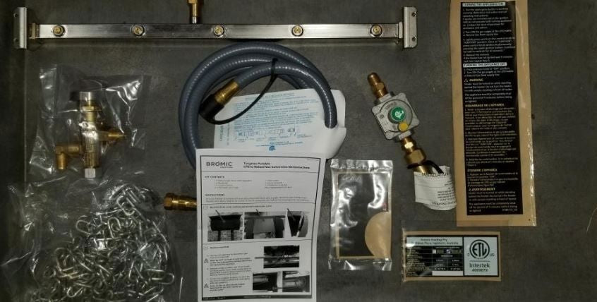 This Bromic Heating conversion kit (BH8280050) allows you to convert your propane gas Tungsten Smart-Heat Freestanding Patio Heater into a natural gas patio heater in less than 30 minutes. Fits Bromic Heating Bromic Heating Tungsten Smart-Heat Freestanding Patio Heater. Includes natural gas manifold, natural gas heater valve, hose, NG regulator, regulator holder, fasteners and a safety chain in case of tip-overs. All conversions should be performed by a licensed plumber.