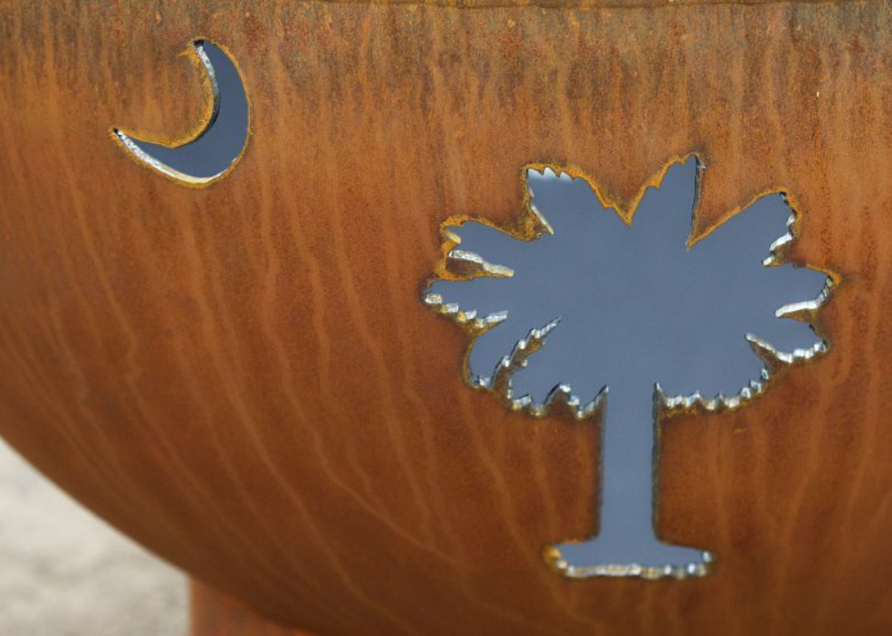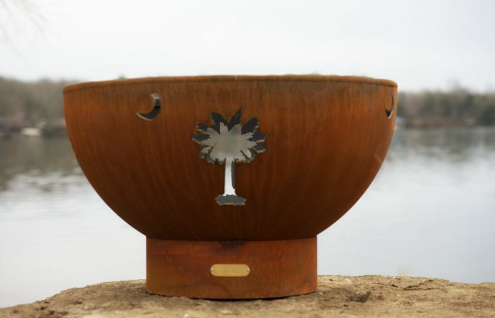 This original design is made to order by Tennessee craftsman in the heartland of America. They are constructed from heavy duty ¼ “ thick mild carbon steel and are the most durable steel fire pit made anywhere. The inner bowl has a high temperature resistant coating and comes with a 1 ½” diameter rain drain. The outer iron oxide patina is maintenance free and the fire pit can be left outside in all weather conditions. Over time and use the patina will mature and darken a few shades and then remain permanent forever. Each unique fire pit is individually numbered by the artist on an attached brass plaque.