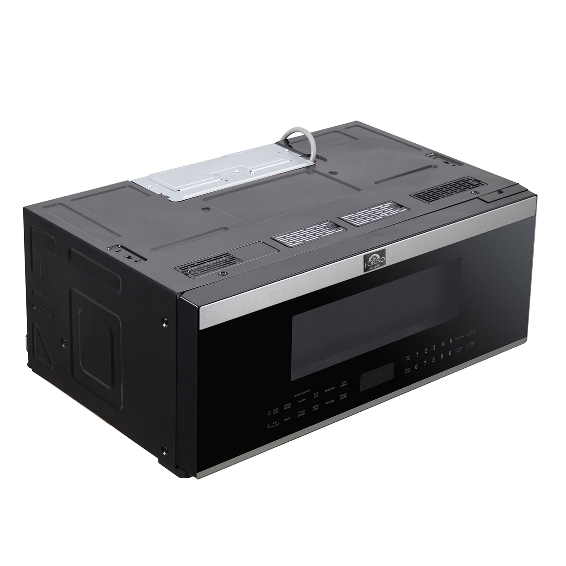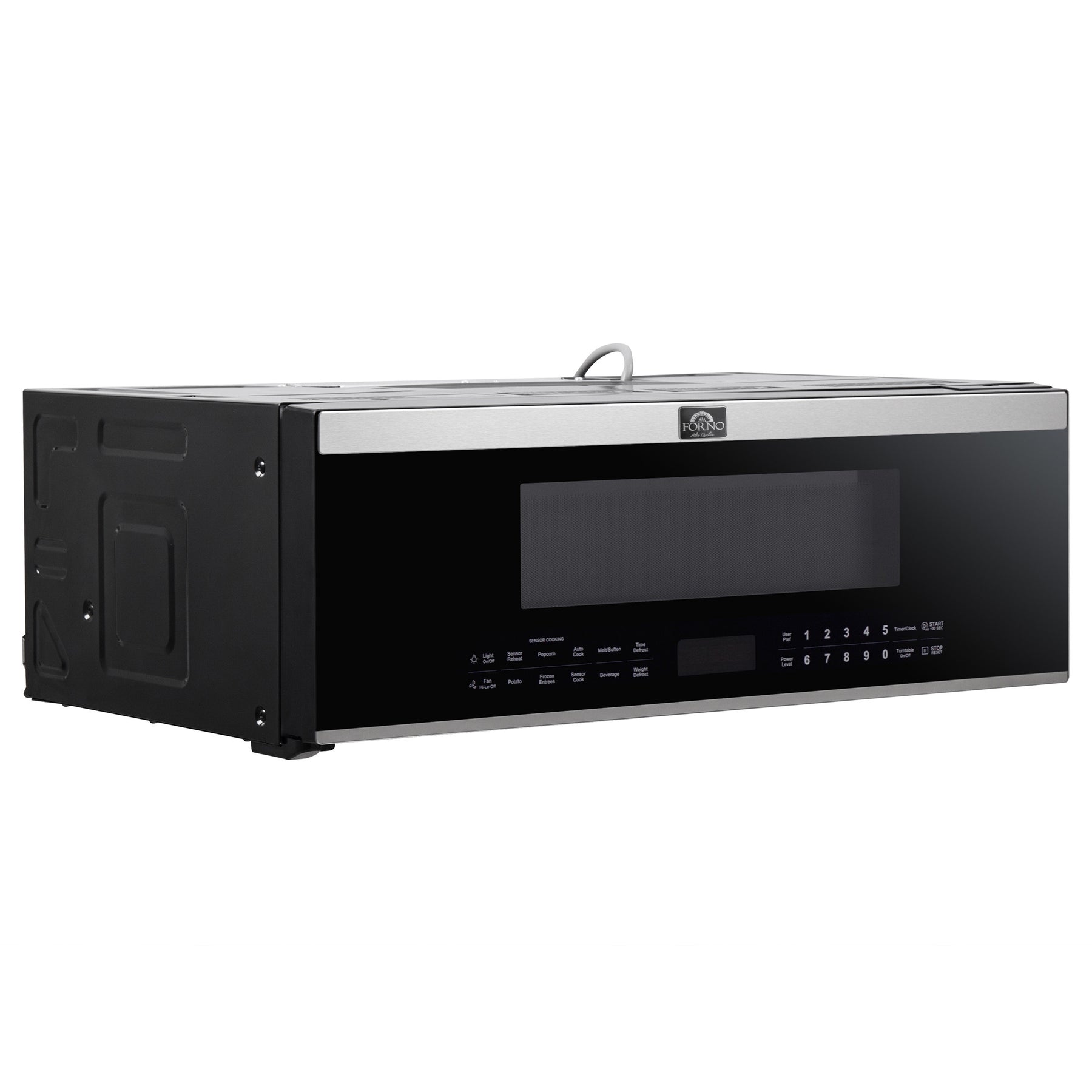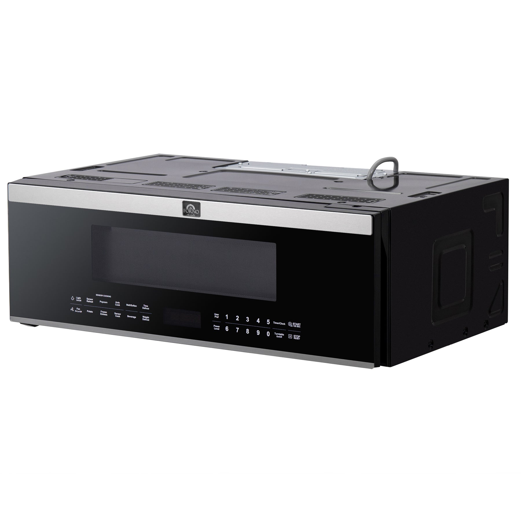 The Forno Padula Over-the-Range Microwave redefines convenience, style, and functionality, making it a must-have for modern kitchens. With its sleek finish and compact design, it seamlessly blends with your décor while saving valuable space. Despite its compact size, the 1.2 cu.ft. interior capacity easily accommodates plates up to 12" wide, making it perfect for everything from quick snacks to bigger meals. The advanced sensor cooking technology ensures perfectly prepared dishes every time by automatically adjusting power and cooking times. Paired with pre-programmed modes for defrosting, reheating, and more, meal preparation is easier than ever. With 400 CFM airflow and flexible venting options, you can choose between a recirculating charcoal filter or ducted installation, keeping your kitchen fresh and clean. Additional features like an intuitive touch control panel, bright LED task lighting, quiet dual-speed fan, and non-stick interior enhance usability and make cleanup a breeze.