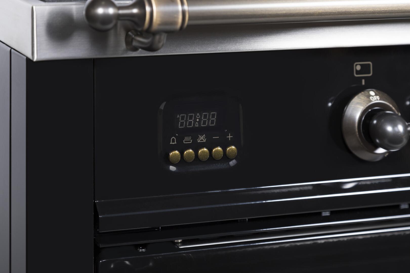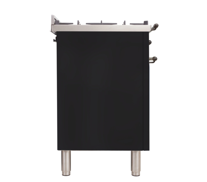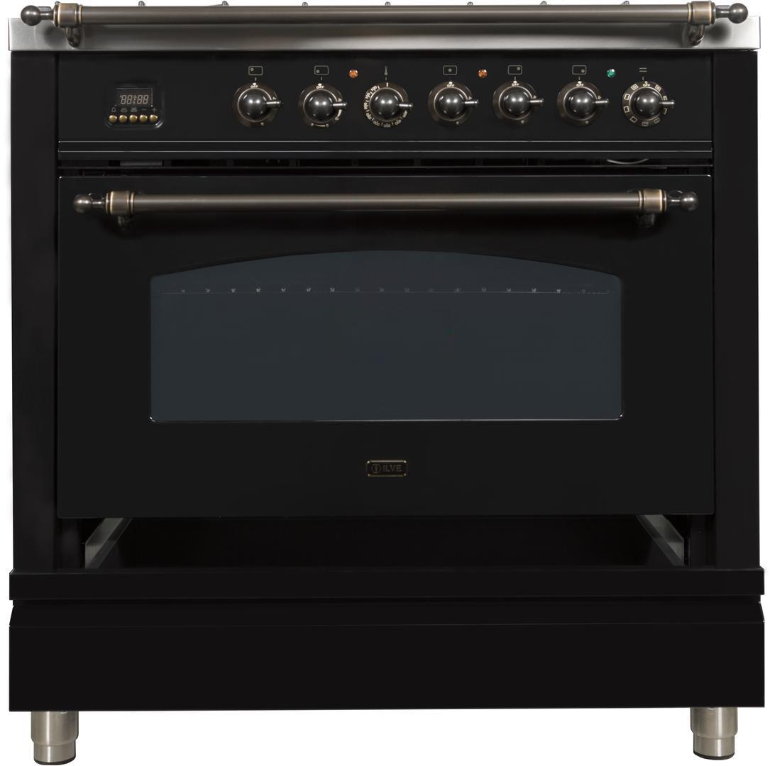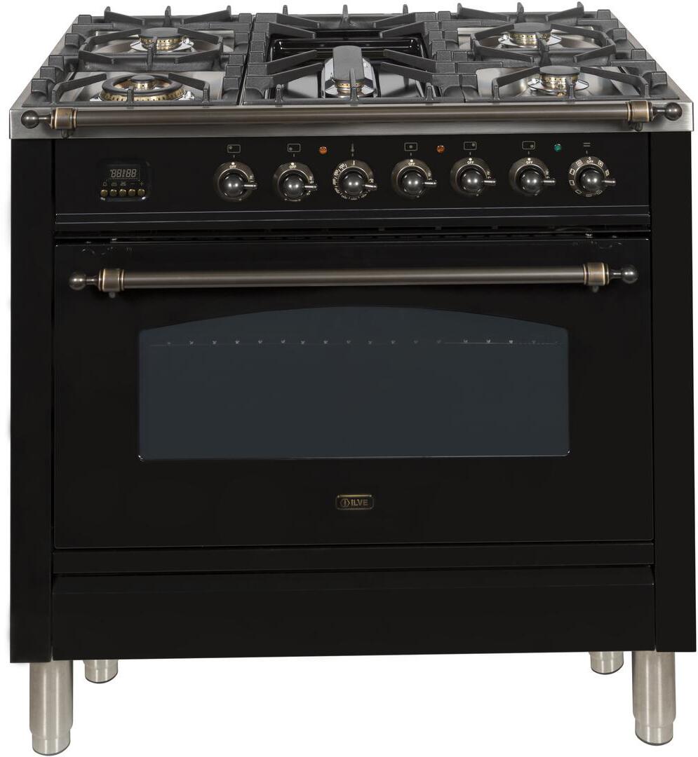 Nostalgie Series 36 Inch Freestanding Dual Fuel Range with Liquid Propane, 5 Sealed Brass Burners, 3.55 cu. ft. Total Oven Capacity, Griddle, Convection Oven, Continuous Grates, Viewing Window, Storage Drawer, True European Convection, Handcrafted from Italy, High-End Workmanship, Dual Function Triple Ring Burner, Oven: Defrost Function, 220 Volts, Gas Conversion Kit Included in Glossy Black with Bronze Trim