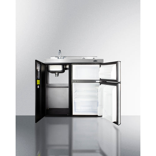 Summit brings true convenience to smaller spaces with all-in-one combination kitchenettes. Available in a variety of sizes and finishes, these units come fully featured with everything you need for the home foodservice experience, including a 2-burner smooth-top cooktop, sink, storage cabinet, and refrigerator with a freezer compartment. The CK36ELGLASS is a 36" wide kitchenette with an easy-fitting 24" depth. Its black exterior brings a modern look to efficiency spaces, with added touches of stainless steel on the kitchenette work surface and refrigerator doors. This unit includes a built-in 115V smooth-top cooktop with a 6" 600W and 7" 900W heating element. The power cord comes pre-installed for easy setup. The left side of the kitchenette features a compact sink with ready-to-use faucet. A cabinet with a removable shelf is located below the sink for dry storage. Unlike many other brands' kitchenettes, all Summit units include a refrigerator with a freezer compartment to cover all of your cold storage needs. The CK36ELGLASS includes the two-door, ENERGY STAR certified CP34BSS, with 3.2 cu.ft. of storage space. A dual evaporator system separately cools the auto defrost refrigerator section and manual defrost freezer compartment for improved overall performance. This model also includes an adjustable glass shelf, door storage, and a crisper. The CK36ELGLASS is packaged and shipped in one box. Perfect for studio apartments, hotel rooms, dormitories, assisted living facilities, temporary kitchen facilities, and any other location in need of a low maintenance, fully-featured compact kitchenette. Additional choices are available with radiant cooktops, and in 30", 39", 48", and 60" wide sizes. Browse our website for more.