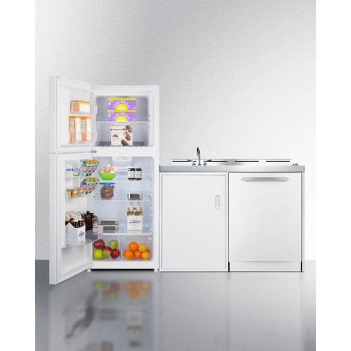 Includes a full-sized refrigerator-freezer, 24" dishwasher, 2-burner cooktop, sink with faucet, and storage cabinet
