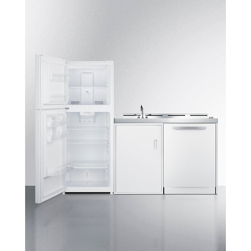 Model ACKDW72 is comprised of three pieces:  our ENERGY STAR certified 10.1 cu.ft. frost-free FF1088W refrigerator-freezer; our C48EL kitchenette with sink, cabinet, and cooktop; and our DW242WADA 24" dishwasher. The exterior features a clean white finish, with stainless steel accents on the kitchenette work surface and dishwasher handle to elevate your kitchen style.
