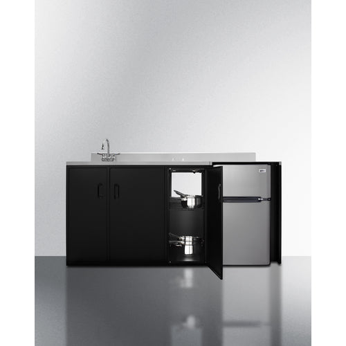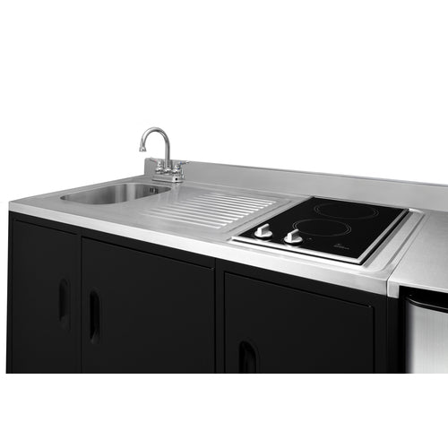 Summit brings true convenience to smaller spaces with all-in-one combination kitchenettes. Available in a variety of sizes and finishes, these units come fully featured with everything you need for the home foodservice experience, including a 2-burner smooth-top cooktop, sink, storage cabinets, and refrigerator with a freezer compartment. The CK72ADASINKL is 72" wide with a 34" ADA counter height for added accessibility. Its black exterior brings a modern look to efficiency spaces, with added touches of stainless steel on the kitchenette work surface and refrigerator doors. This unit includes a built-in 115V smooth-top cooktop with a rear 7" 900W and a front 5½" 500W heating element. The power cord comes pre-installed for easy setup. The left side of the kitchenette features a compact sink with ready-to-use faucet, while the right side has a stainless steel counter area for food prep. Two single-door cabinets include a removable wire shelf, perfect for storing cleaning supplies, while a French-door style cabinet has a sold removable shelf, ideal for dry storage. Two grooved handles on each side allow for easy movement of the unit. Unlike many other brands' kitchenettes, all Summit units include a refrigerator with a freezer compartment to cover all of your cold storage needs. The CK72ADASINKL includes the two-door, ENERGY STAR certified CP34BSS, with 3.2 cu.ft. of storage space. A dual evaporator system separately cools the auto defrost refrigerator section and manual defrost freezer compartment for improved overall performance. This model also includes an adjustable glass shelf, door storage, and a crisper. The CK72ADASINKL is packaged and shipped in one box. Perfect for studio apartments, hotel rooms, dormitories, assisted living facilities, temporary kitchen facilities, and any other location in need of a low maintenance, fully-featured compact kitchenette. For this unit with a sink located on the right of the kitchenette, see the CK72ADASINKR. Note: For users who prefer a gas connection, Summit model GC22SS can fit inside the existing 11" W x 19 1/4" D cooktop cutout. Additionally, users can remove the center storage cabinet and install an 18" wide ADA compliant dishwasher, such as Summit model DW18SS4ADA.
