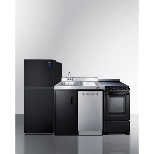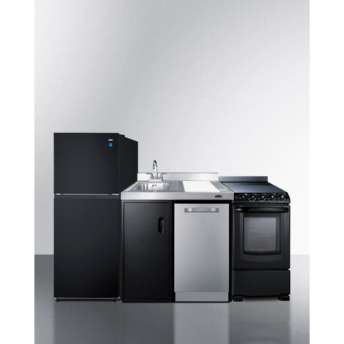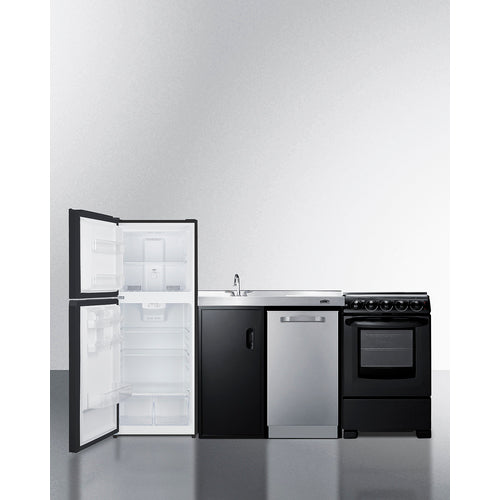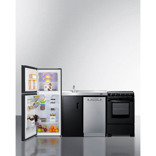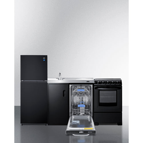 Summit brings innovative value into the kitchen with all-in-one combination units for full-service use. Our ACK80HT features a full-sized refrigerator-freezer, dishwasher, electric range, sink, and storage cabinet to create a complete one-wall kitchenette, ideal for hospitality spaces. Model ACK80HT is comprised of three appliances: our 24" wide FF1087B refrigerator-freezer; our North American-made REX2051BRT electric smooth-top range with four burners; and our DW185SSADA 18" dishwasher. The kitchenette includes a storage cabinet. The stainless steel work surface features a small cutlery bin, with a removable cutting board cover to ensure easy food prep. The exterior comes in a modern black finish, with stainless steel accents on the kitchenette and dishwasher to elevate your kitchen style. The ENERGY STAR certified FF1087B refrigerator offers 10.1 cu.ft. of storage capacity. Frost-free operation ensures minimum user maintenance. The refrigerator section includes adjustable glass shelves, a large crisper drawer, and door storage for gallon-sized containers, while the large freezer includes a removable shelf and door rack. The REX2051BRT is made in North America with a full oven that includes a 2.3 cu.ft capacity and waist-high broiler. The smooth cooking surface features four 6 1/2" 1200W elements. The ACK80HT ships with our European DW185SSADA dishwasher. This dishwasher's door and handle are brushed in stainless steel with a horizontal grain. The intuitive top-located digital controls let you choose between 8 wash programs with 5 auxiliary functions, including a half-load setting for added water savings. The dishwasher also includes its own pre-installed 3-prong cord. The stainless steel sink features a hot and cold water faucet. Note: This unit ships in four boxes and will require some installation. In addition to the ACK80HT, Summit's expanded selection of all-in-one kitchenettes includes choices with full-sized ranges, washer/dryer laundry combos, water pumps for no-plumbing applications, and much more. Explore the full lineup or contact our product specialists for more information.