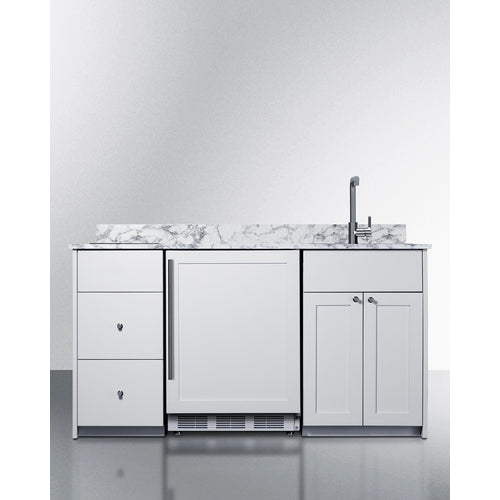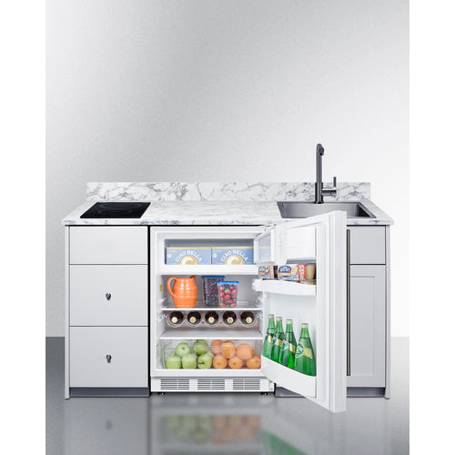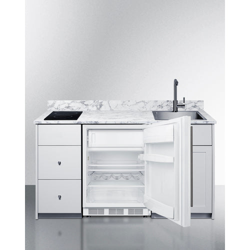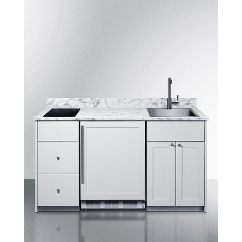 The Caldera is a 63" wide kitchenette in a classic white finish, sized just under 34" to comply with ADA guidelines for lower counter height. It features hardwood construction and a countertop made from a water-resistant laminate material with a marble look, with a pre-installed 2-burner induction cooktop included. We include a stainless steel sink with faucet and 5 cu.ft. refrigerator-freezer for food storage.  For dry storage, this model has a two-door cabinet and two soft-close drawers. We also supply the door knobs in an attractive brushed nickel finish. The cabinetry comes in a classic shaker style. For this unit with the sink located on the left side, see model CALDERAWH33ISINKL.