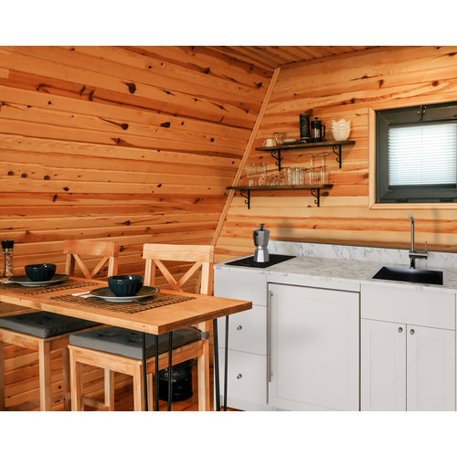 The Caldera Kitchen series includes sleek, functional, and fully assembled kitchenettes, featuring a European refrigerator-freezer, a 115V powered induction cooktop, and a stainless steel sink complete with a faucet