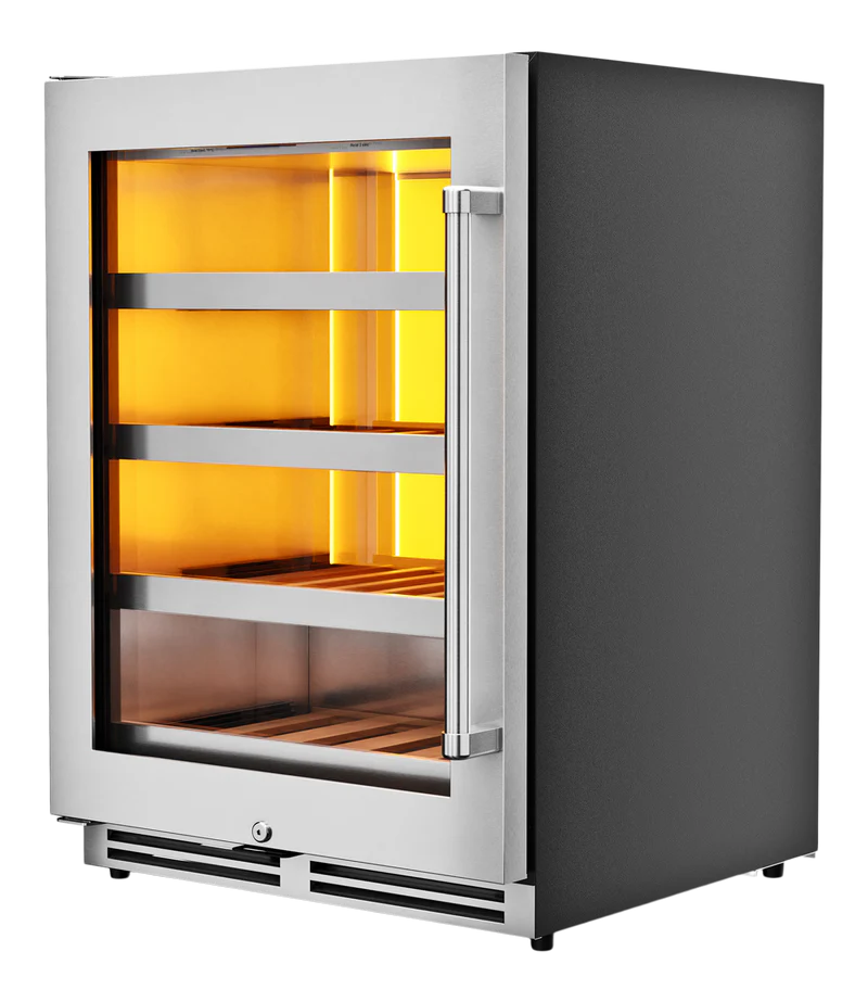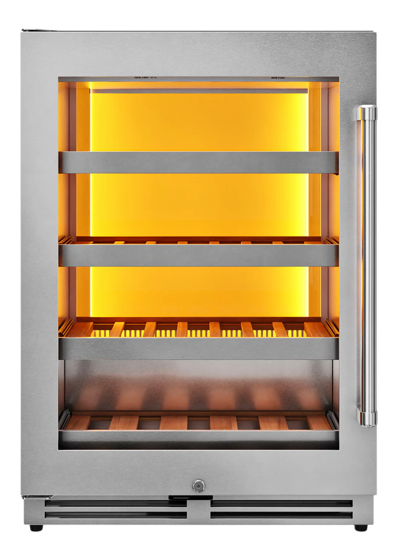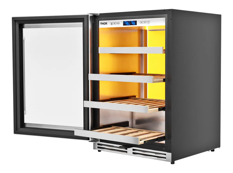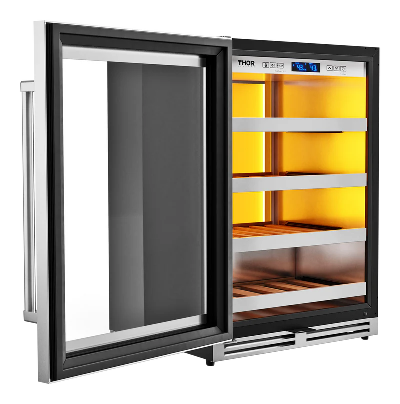 THOR Kitchen offers the power and performance of a premium professional appliance at a practical price. THOR Kitchen's 24 Inch Left Swing Door Single Zone Wine Cooler, 45 Wine Bottle Capacity offers a wide range of models with important attention to detail to best accommodate your wine preservation requirements and personal taste—in wine, as well as décor. This beautifully designed 24-inch Single Zone Wine Cooler has a 45-wine bottle capacity and can easily fit a full selection of wines. What is a perfectly cooked masterpiece without a perfectly preserved wine pairing?