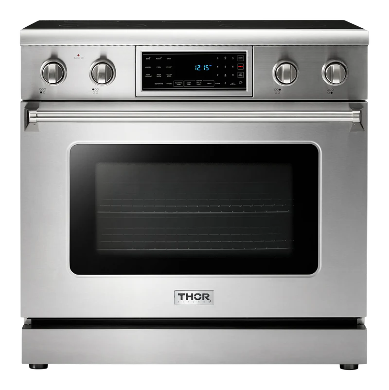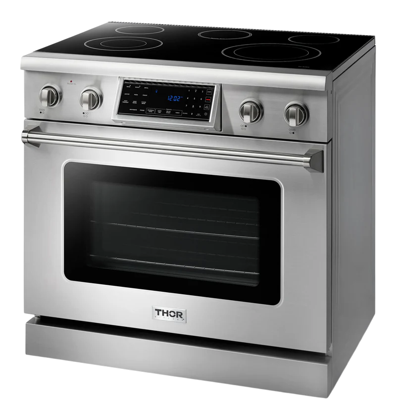 THOR Kitchen offers the power and performance of a premium professional appliance at a practical price. The THOR Kitchen 36 Inch Tilt Panel Professional Electric Range is a stainless-steel machine designed with professional features and functionality. With easily accessible tilt panel touch controls, high-powered elements, and commercial convection fan, this electric range takes everything from prime rib to snickerdoodles to the next level.ย