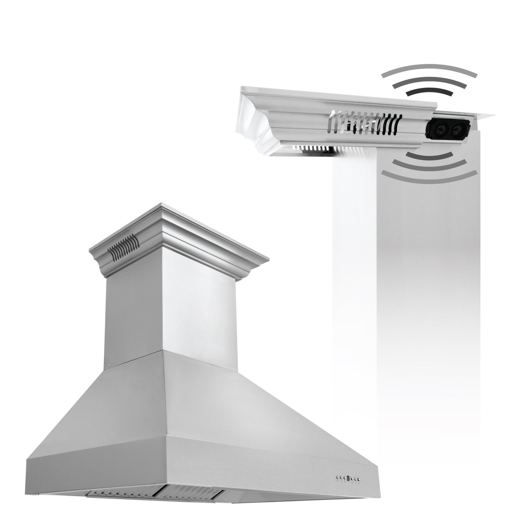 The ZLINE Wall Mount Range Hood with Built-in CrownSound™ Bluetooth Speakers transforms the seamless, elegant ceiling transition of ZLINE Range Hoods into a high-fidelity, wireless sound system, creating the perfect entertainment area for you and your guests. With CrownSound™, you can pair your smart device up to 50 feet away for optimal access and control of audio in your kitchen. The high-performance 400 CFM, 4-speed motor provides all the power you need to quietly and efficiently ventilate your kitchen while hosting kitchen dance parties or listening to your favorite podcasts. With its classic 430 grade stainless steel, this range hood contains rust, temperature, and corrosion-resistant properties to ensure a durable vent hood that will last for years to come. Enjoy modern features, including built-in LED lighting for an illuminated culinary experience and dishwasher-safe stainless steel baffle filters for easy clean-up. This wall mount range hood has a convertible vent, so you can have a luxury range hood whether you need a ducted or ductless option. Achieve a functional, modern upgrade that is perfectly harmonized in your favorite ZLINE Range Hood designs. ZLINE continues to revolutionize the industry by providing our customers with Attainable Luxury®. ZLINE proudly stands by the longevity and durability of their range hoods alongside its 3 year manufacturer parts warranty.